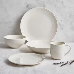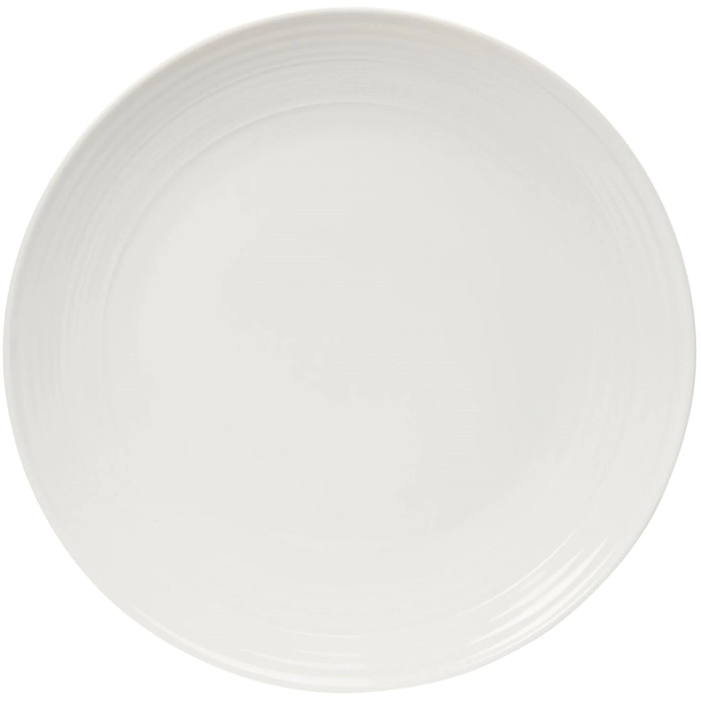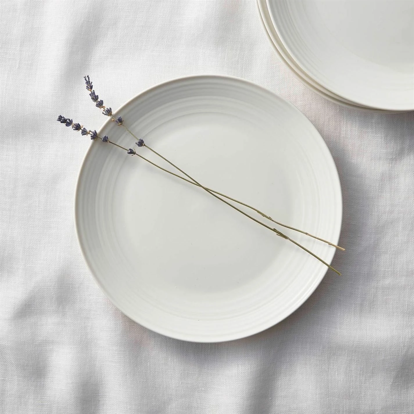 Elevate your dining experience with this Aspen fine china dinner plate set of four by Linea. Accented with a gentle embossed pattern for added opulence, it is a sleek addition to your dinnerware collection.