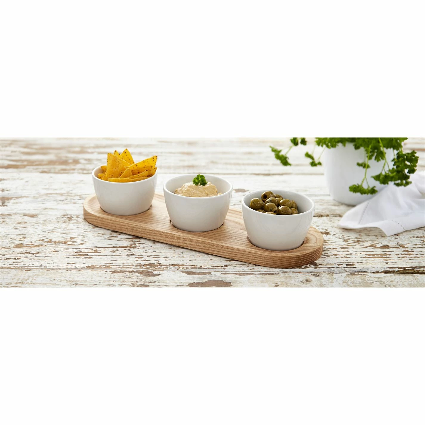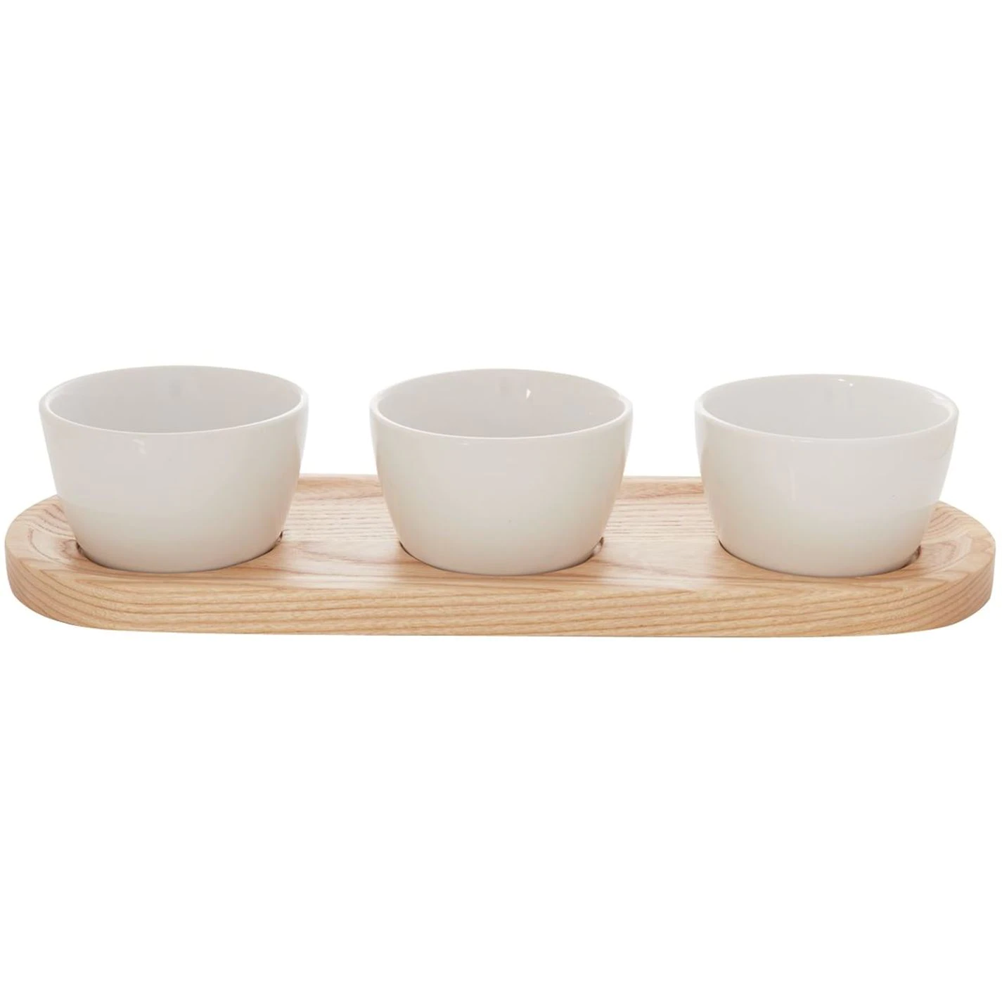 The Easy Entertaining Serveware range by Linea is a classic and sophisticated way to present your food. This set includes a rectangular ash wood platter and 3 ceramic dip bowls (10cm).