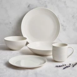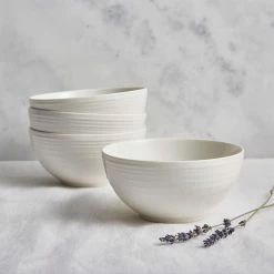 Expertly designed for modern kitchens, this Aspen fine china set of four cereal bowls by Linea is a must-have for any table setting. Crafted in a classic shape, it is decorated with a gentle embossed pattern for a sleek touch. Pair with matching pasta bowls and dinner plates to complete a sophisticated set.